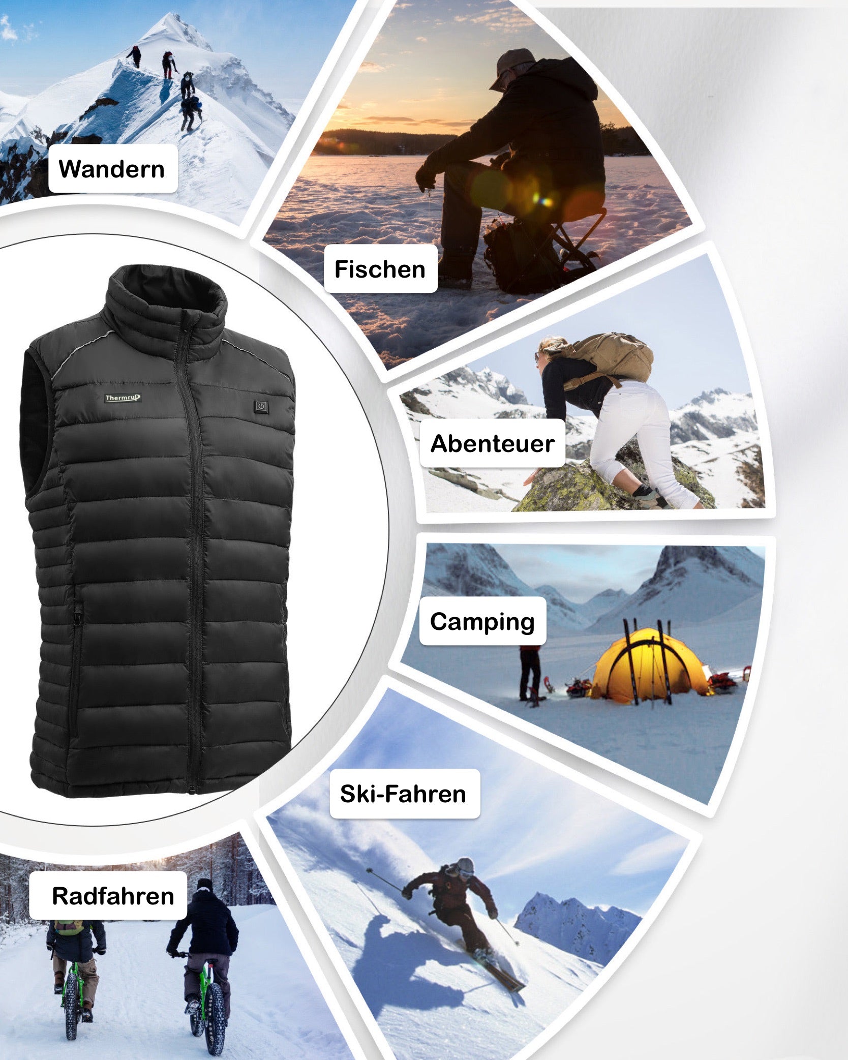 Sie gehen gerne Wandern, Camping, Radfahren oder Ski-Fahren? Dann ist unsere beheizbare Kleidung Ihre beste Begleitung an diesen kalten Tagen. Egal ob beim Gassi gehen mit Ihrem Hund oder an kalten Abenden auf Ihrer Terrasse, die Heizweste von Thermrup erwärmt Sie in jeder kalten Situation. Mit einem Reißverschluss können Sie die Heizweste bis zu Ihrem Hals abdichten und Wind sicher machen. Ihre Hände können Sie in die Seitentaschen tun und ebenfalls warm halten. Durch den 5000mAh Akku ist eine lang anhaltende Wärme gewährleistet und ist jederzeit wieder aufladbar für den nächsten Spaziergang im Freien.