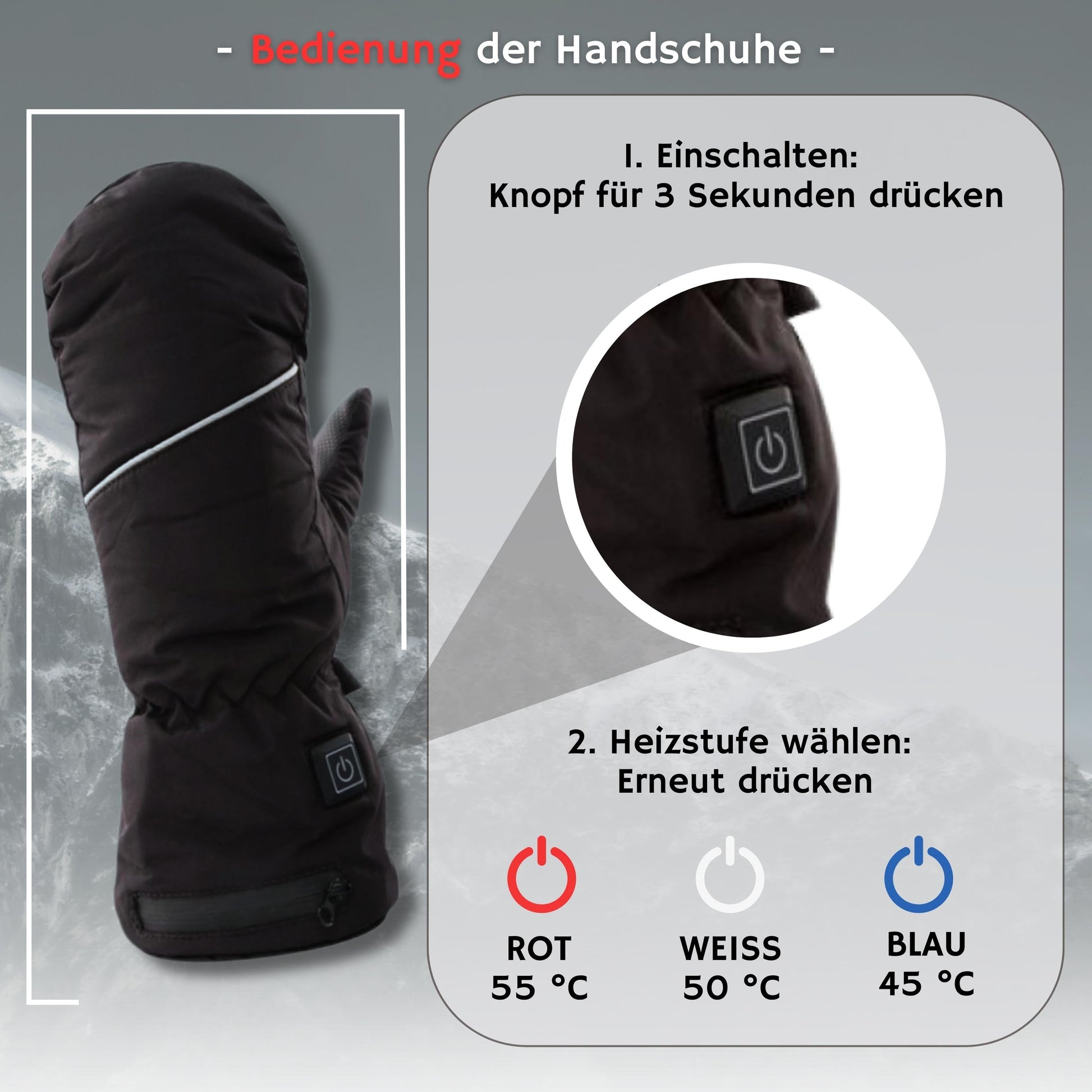 • LEISTUNG & WÄRMESTUFEN: Die elektrisch beheizten Handschuhe verfügen über eine leichte Handhabung mit 3 Heizstufen auf bis zu 55°C in einer den Handrücken bis in die Fingerspitzen abdeckenden Wärmezone; Integriertes Thermo-Schutzmodul, sodass keine Überhitzung möglich ist