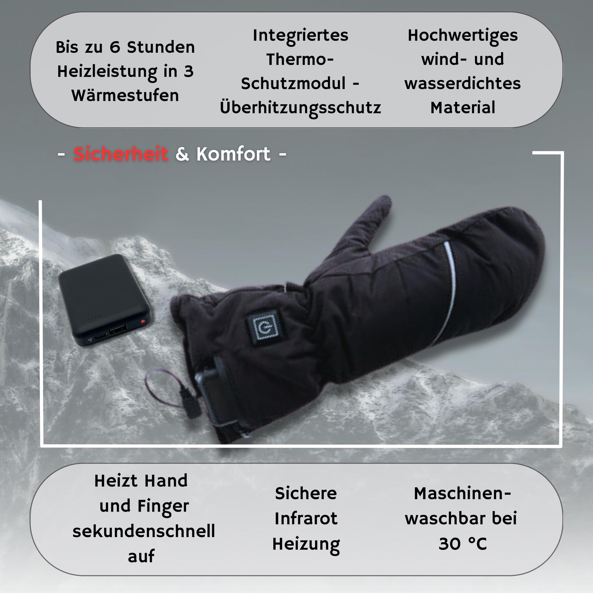 • POWERBANK: 2x Powerbank mit 5V und 2 Amper und 6.000 mAh, eine pro Handschuh. Die Smart-Lithium-Polymere Batterien sind im Lieferumfang für die elektrisch beheizten Fäustlinge enthalten. Sie sind abnehm- und austauschbar.